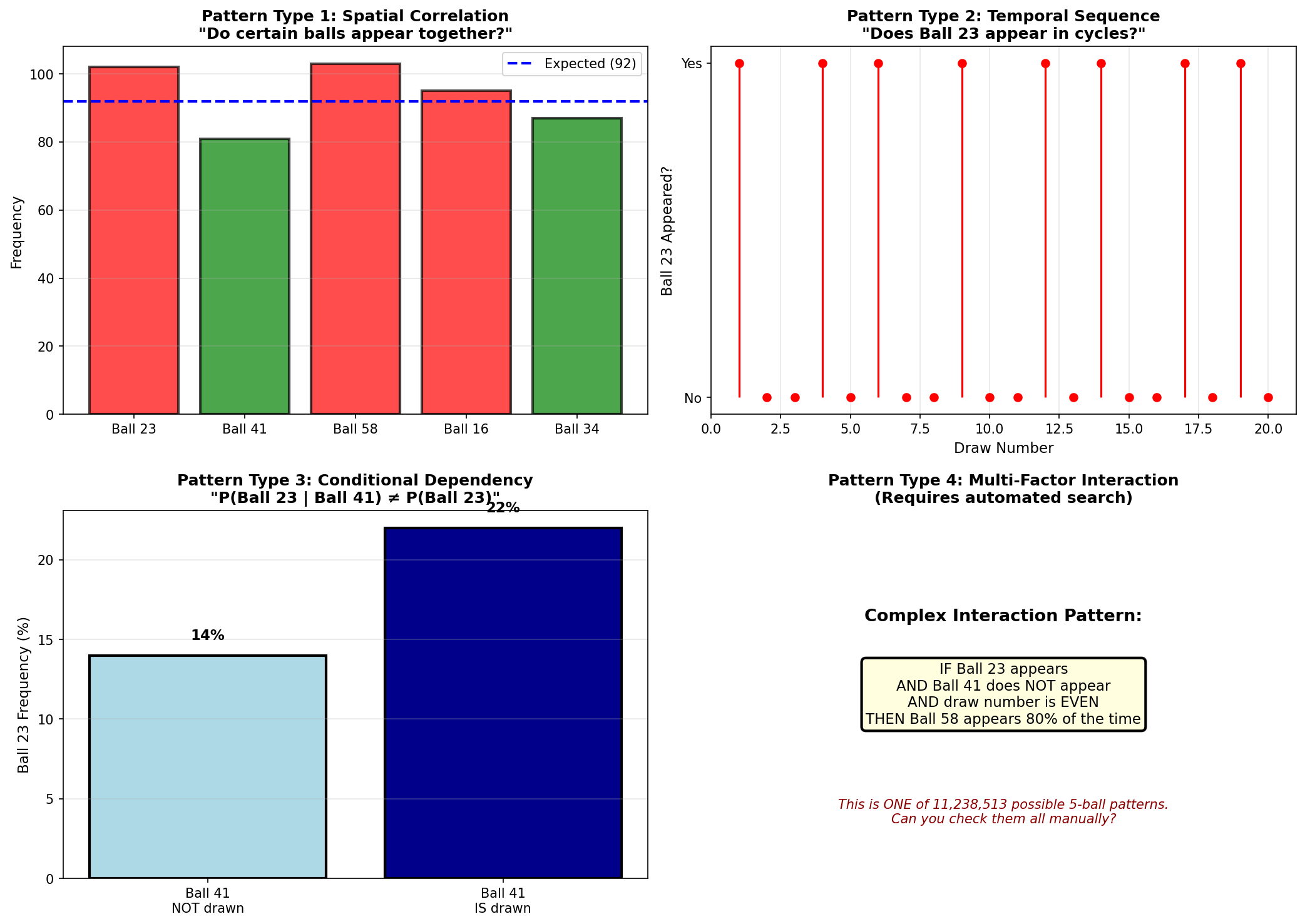 But we cannot test all 11 million 5-ball combinations. We cannot check temporal sequences. We cannot explore conditional dependencies automatically.